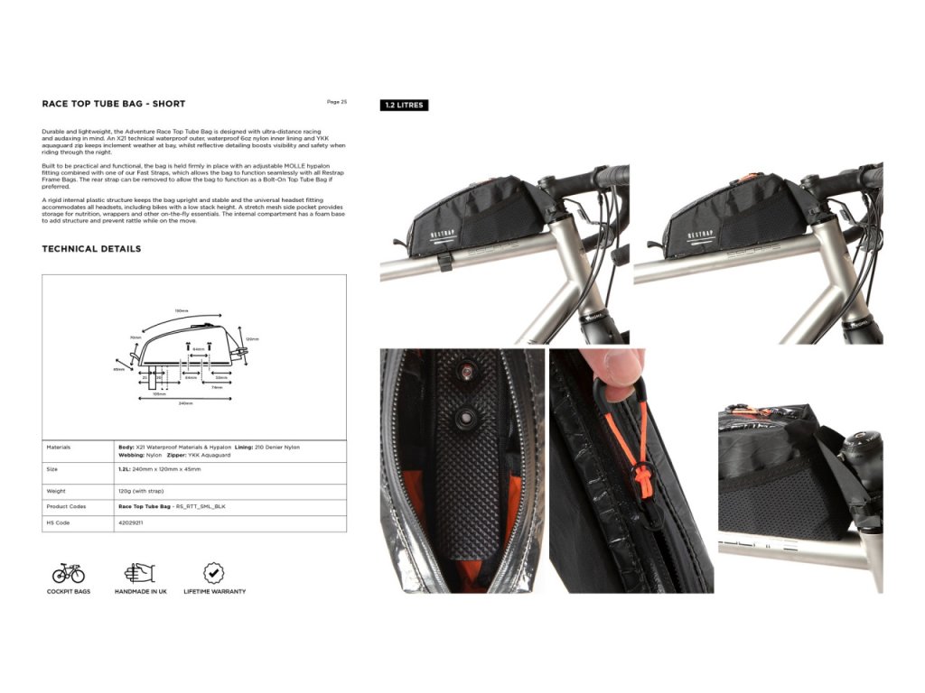 Brašna je navržena tak, aby byla praktická a funkční, a je bezpečně upevněna pomocí gumového suchého zipu a nastavitelného upevnění MOLLE Hypalon, které umožňuje bezproblémovou spolupráci se všemi brašnami Restrap. Pevná plastová vnitřní konstrukce udržuje brašnu ve vzpřímené poloze a stabilitě, zatímco boční kapsa z elastické síťoviny poskytuje úložný prostor pro výživu, batohy a další nezbytnosti během jízdy.