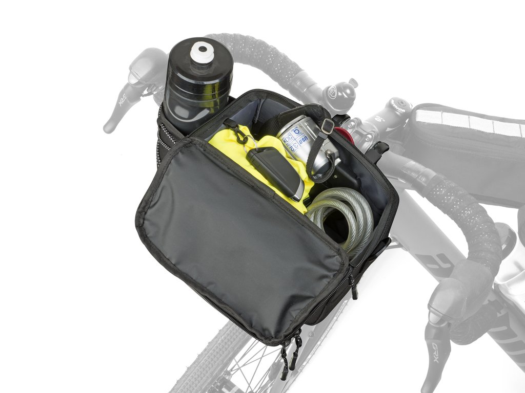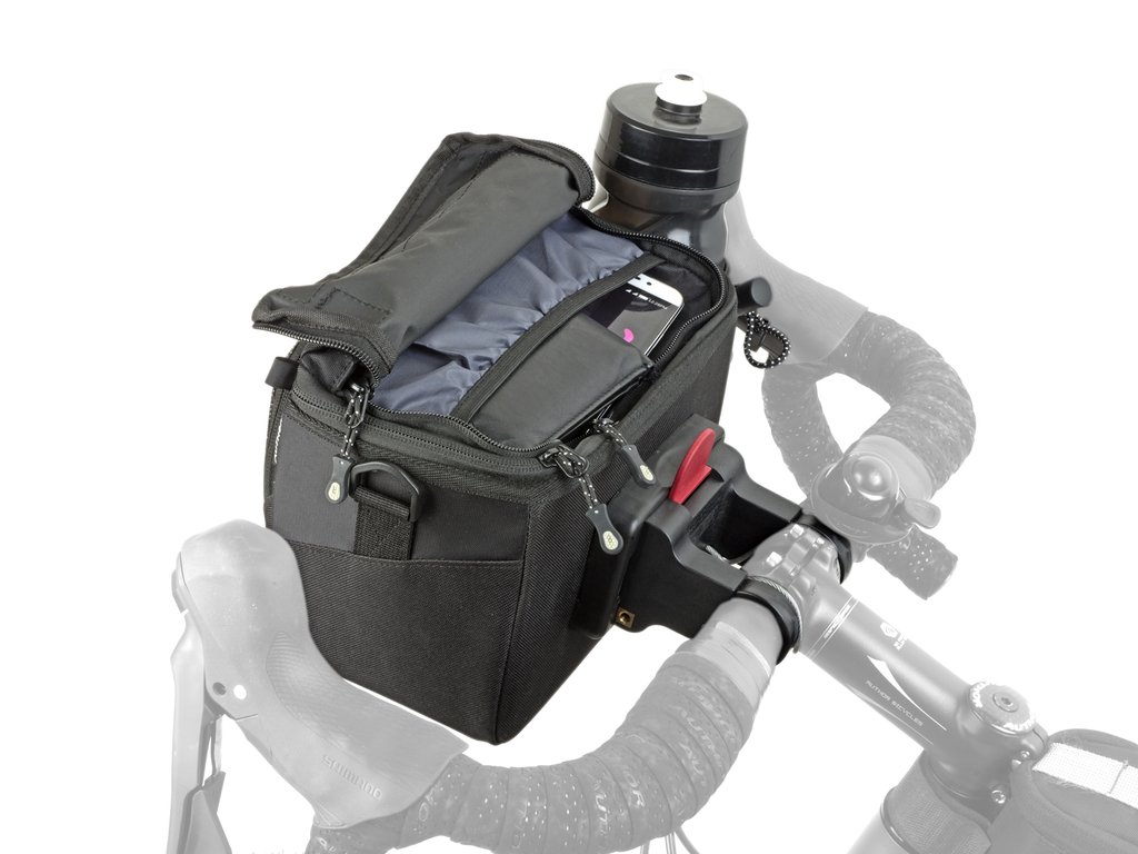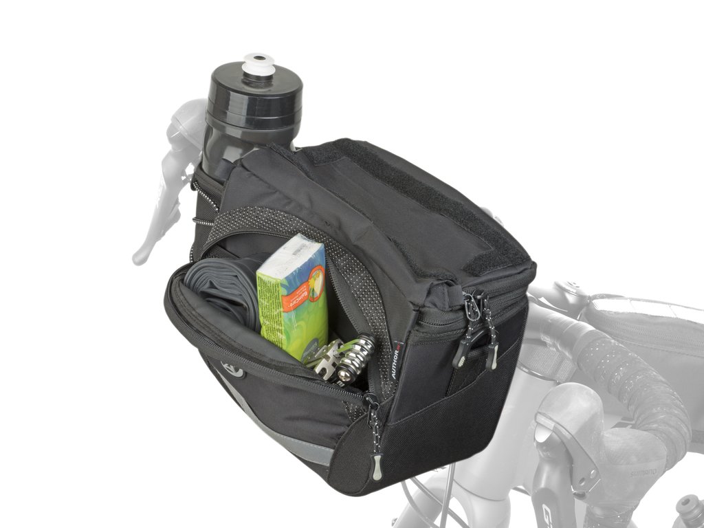 Plně vybavená brašna na řídítka s držákem QRA™. Speciální kapsa na mapu se zapínáním na suchý zip umožňuje snadnou manipulaci a čtení mapy. Na boku je univerzální kapsa se stahovací šňůrkou na láhev nebo případně přibalení větrovky. V přední a horní části jsou samostatné kapsy na zip vhodné pro přenášení potřebných drobností (peněženka, telefon, kapesníky...). Konstrukce kombinuje panely vyztužené pěnou EVA s přizpůsobivou tkaninou pro dostatečnou pevnost tašky a ochranu přenášených věcí. Doporučujeme pro delší jízdy, výlety a cestování.