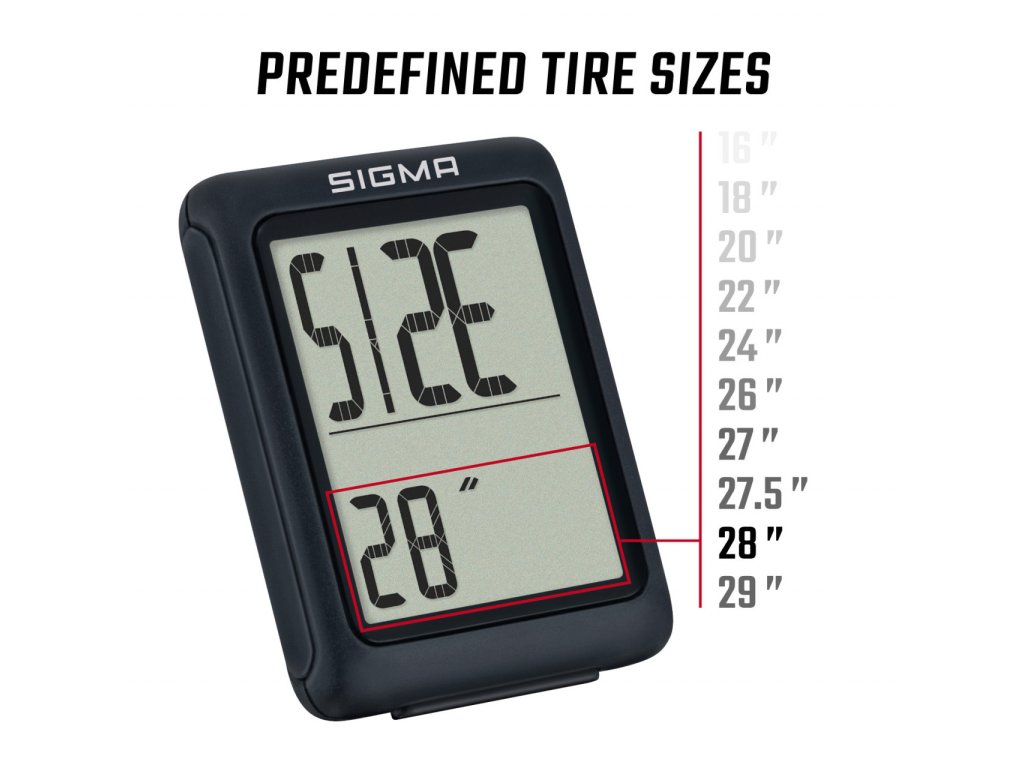 Díky předdefinovaným rozměrům pneumatik je nastavení BC 5.0 WL snadné - od malých dětských kol až po 29" kola. Obvod pláště však lze zadat i ručně s přesností na milimetry.