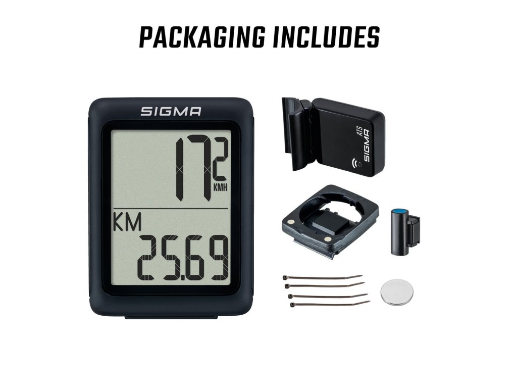 Cyklocomputer (včetně baterie), bezdrátový držák modelu, vysílač ATS (včetně baterie), magnet, upevňovací materiál, návod k použití