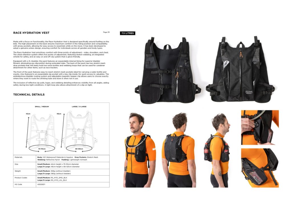 Hydratační vesta Race je navržena s ohledem na funkčnost a je speciálně vyvinuta pro optimální doplňování tekutin při jízdě na kole. Vysoké umístění na zádech zajišťuje maximální pohodlí v jízdní pozici a kompatibilitu s kapsami na dresu, což umožňuje snadný přístup k nezbytnostem během jízdy. Byl vyvinut tak, aby poskytoval skutečně unisexový design, který zajišťuje pohodlí pro jedince všech pohlaví a typů postavy.