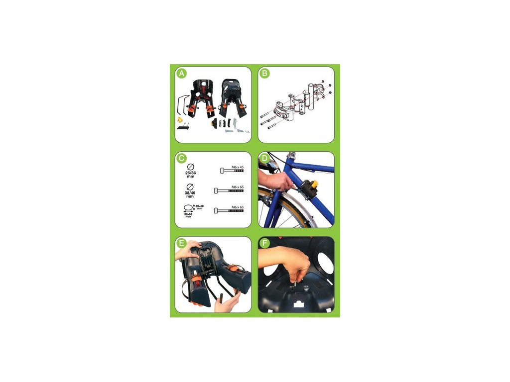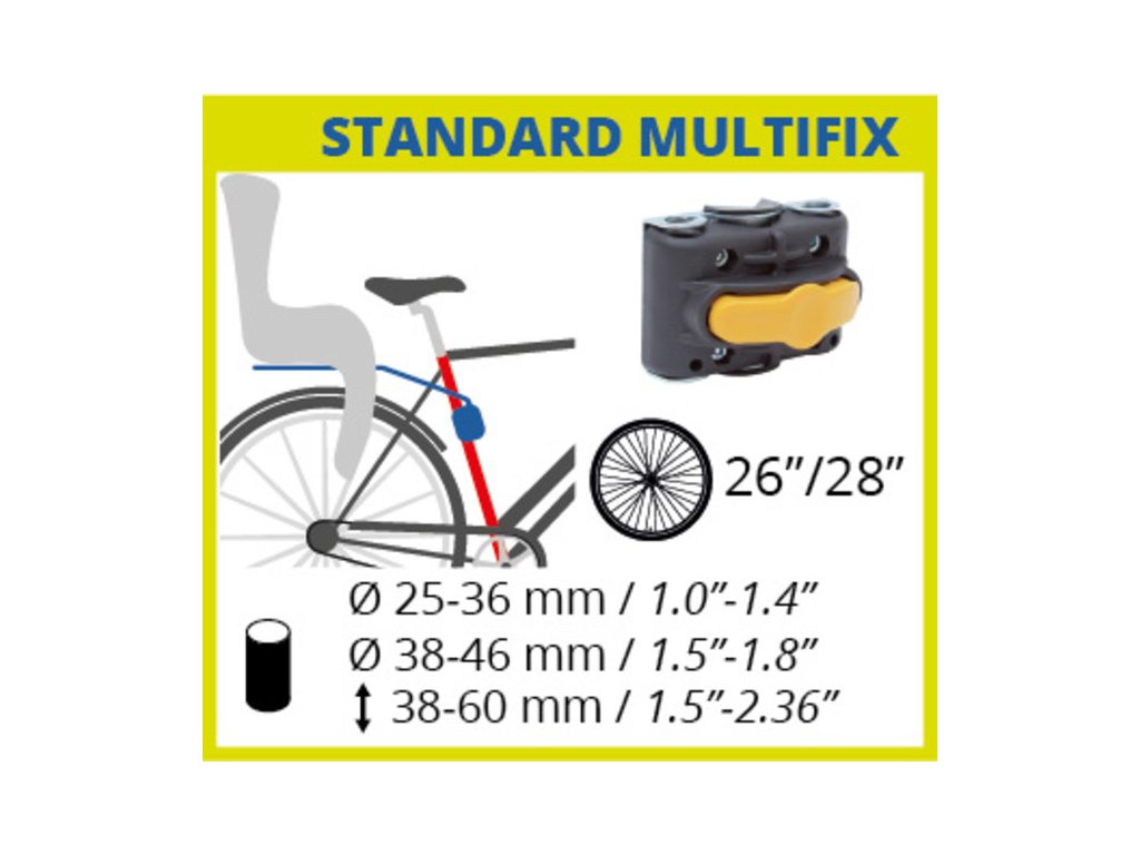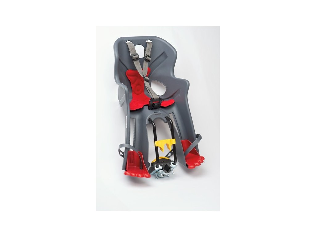 samonosná přední dětská sedačka s upevněním na pánský nebo dámský rám (na rámovou trubku o průměru 25-46 mm) pomocí ocelového držáku - popruhy na nohy - bezpečnostní pásy s pojistkou - nastavitelná výška opěrek nohou - chrániče zabraňující kontaktu nohou s kolem - polstrování - větrací otvory pro odvětrávání zadního opěradla - nosnost až 15 kg - certifikace EN 14344 - země původu: Itálie