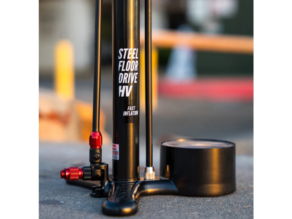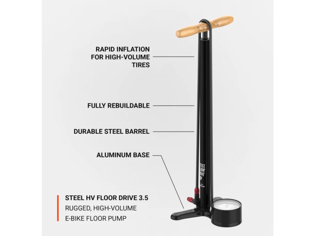 Pumpa Steel HV Floor Drive 3.5 je špičková cyklistická podlahová pumpa s obráběnou hliníkovou základnou, větším, odolným ocelovým válcem a pístem připevněným k ergonomické rukojeti z lakovaného dřeva, která nabízí o 25 % větší objem vzduchu na jeden zdvih pro rychlejší huštění větších pneumatik. Je vybavena vysoce přesným tlakoměrem 3,5" až (100 psi/6,89 bar), mimořádně dlouhou hadicí s vysokou pevností a sklíčidlem ABS-1 Pro kompatibilním s pneumatikami Presta a Schrader pro rychlé, přesné a dosažitelné nafouknutí.