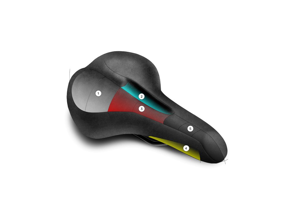 Design Five-Step-Design rozděluje sedlo na 5 různých polstrovaných zón, což zajišťuje vysoký komfort při dynamické jízdě.