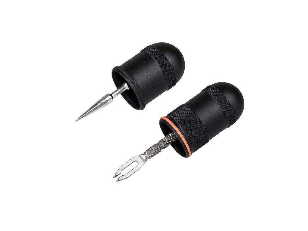 Velmi kompaktní a zároveň minimalistická sada pro opravu průrazů bezdušových pneumatik v nouzových podmínkách. - Duralová duše obsahuje potřebné nářadí uložené v uzávěrech se zdrsněným povrchem pro lepší manipulaci (těsnicí adaptér, 2