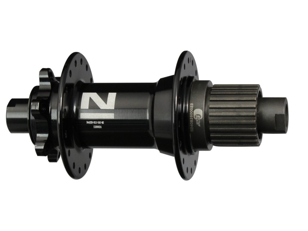 Zadní náboj D442SB-B12-S4S-MS, boost, eloxovaný černě, s laserovým logem N14, 32x14G, Cr-Mo 12x148, volnoběžka ocel Microspline, D:39.7, B2-427, 3páčky, 7xNBK ložiska, černá, OEM