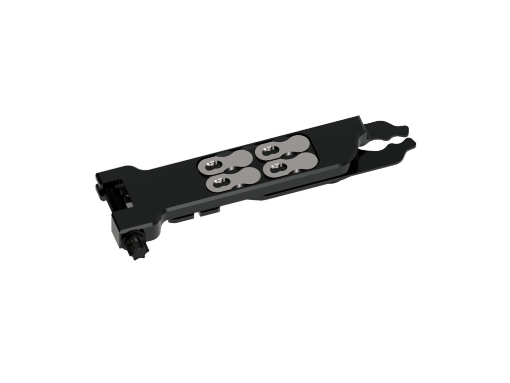 Kleště MULTI CHAIN PLIERS jsou vyrobeny z CNC obráběného hliníku a jsou vybaveny integrovanými kleštěmi na rozpojování a spojování řetězu, nástrojem na jádro ventilu, otvírákem na láhve, seřizovačem rotorů a magnetickými držáky až na dva náhradní články řetězu. Plochá konstrukce nářadí umožňuje maximální přenosnost a je navržena pro dlouhodobé používání. Je také vybaven eloxovanou povrchovou úpravou a čepem pro odpojení řetězu z tvrzené oceli.