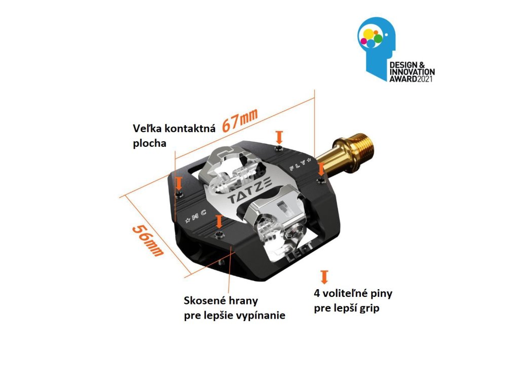 Kompaktní pedál s velkou kontaktní plochou: Š: 67 mm, D: 56 mm, V: 13-17 mm