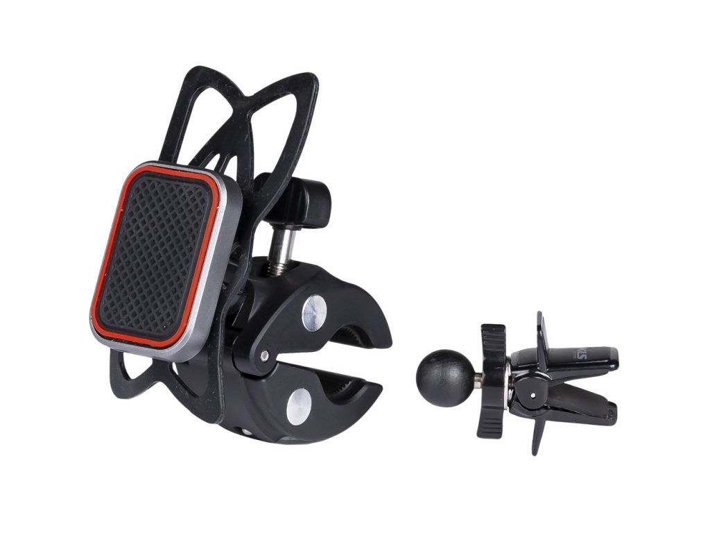 Držák v obalu s příchytkou vhodnou pro auto a kolo.