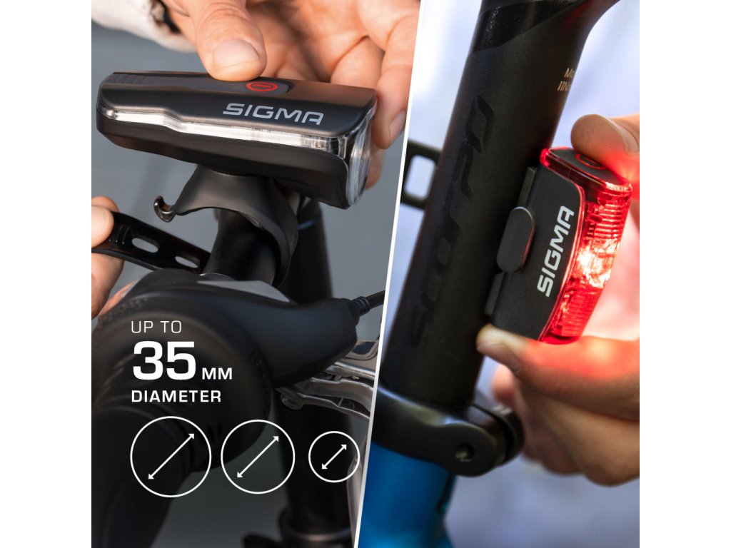 "Sada osvětlení sestávající z předního světla AURA 60 a zadního světla INFINITY od společnosti SIGMA SPORT je spolehlivým průvodcem pro všechny cyklisty, kteří hledají prvotřídní sadu osvětlení. Světla s dobíjecími bateriemi lze snadno namontovat na řídítka nebo na sedlovou trubku a jsou certifikována pro silniční použití. Přední světlo AURA 60 USB je vybaveno technologií LED 60 luxů, která se s dosvitem 70 metrů postará o vynikající osvětlení silnic a ulic, což z této svítilny činí prvotřídní volbu pro sportovní jezdce i příležitostné cyklisty.