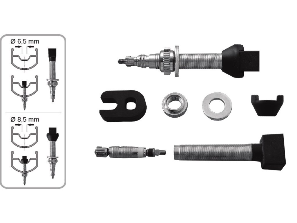 Balení: 2 ventilky, klíč na ventilky, 2x adaptér na ráfky s otvorem pro autoventilek