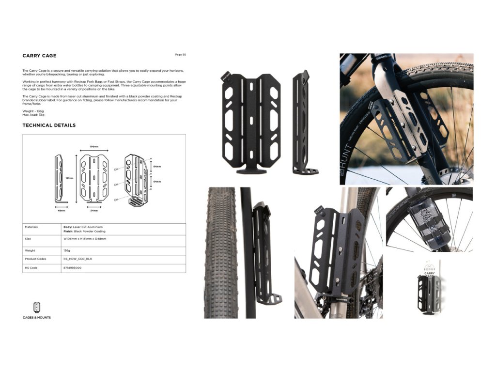 Klec Carry Cage je bezpečné a všestranné přepravní řešení, které vám umožní snadno připojit další zavazadla k vašemu kolu. Klec Carry Cage, která dokonale spolupracuje s brašnami Restrap na vidlici nebo s popruhy Fast Straps, pojme širokou škálu nákladu od dalších lahví na vodu až po kempinkové vybavení. Tři nastavitelné montážní body umožňují montáž klece v různých polohách na kole. Klec Carry Cage je vyrobena z laserem řezaného hliníku a je opatřena černou práškovou barvou a gumovým štítkem s logem Restrap. Pokyny k instalaci naleznete v doporučeních výrobce pro váš rám/vidlici.