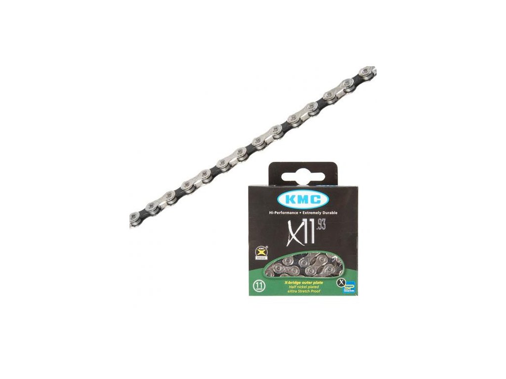 jedenáctirychlostní cyklistický řetěz KMC X11-93 ve stříbrné a šedé barvě je dodáván s rychloupínákem s chybějícím článkem.