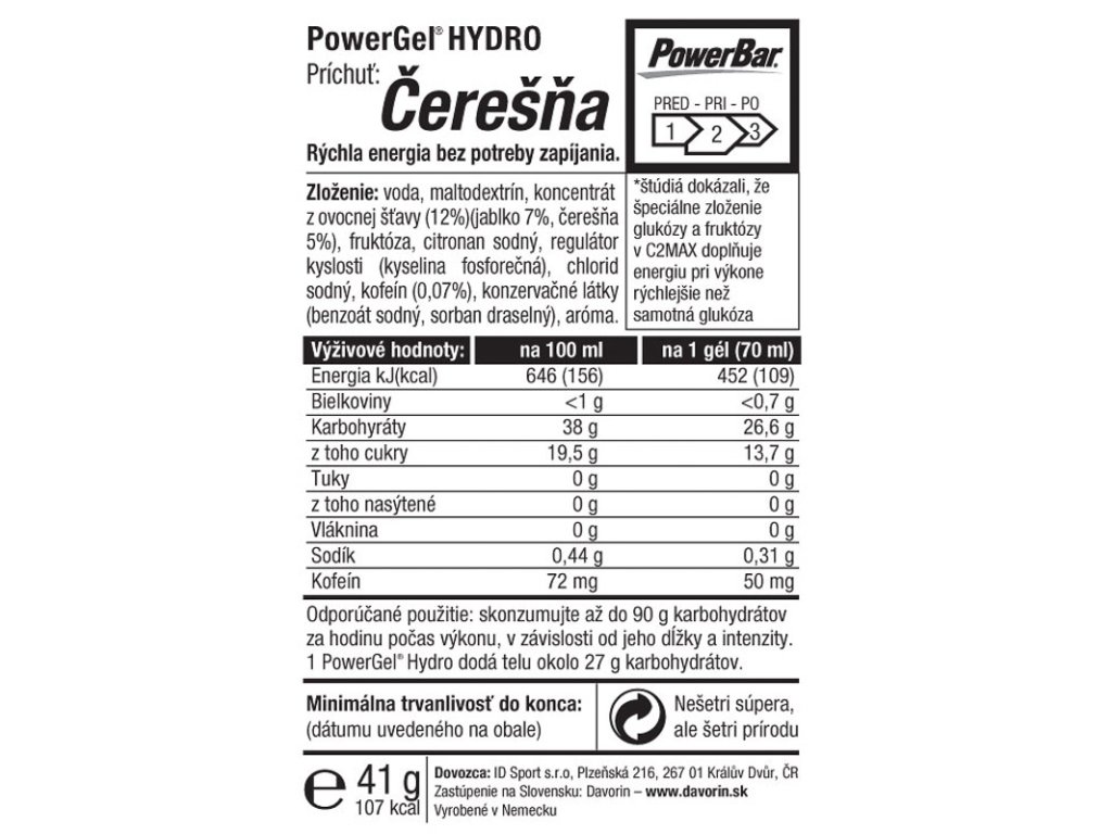 - během cvičení přijmout maximálně 90 g sacharidů v závislosti na jeho intenzitě a délce.1 PowerGel HYDRO obsahuje 26,6 g sacharidů.