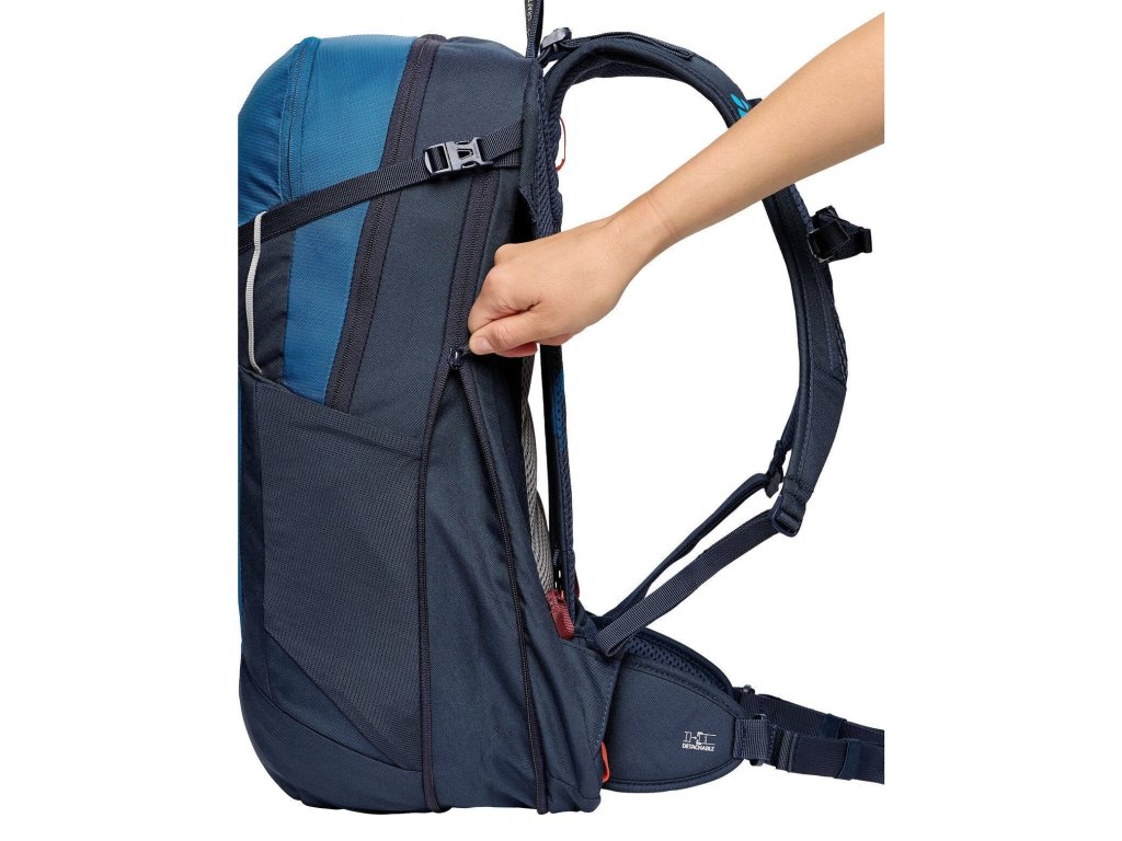 - odnímatelný bederní pás, zvětšení objemu na zip, organizér v přední přihrádce, 2 boční strečové kapsy, boční kompresní popruhy, jeden úchytný bod pro turistické hole, úchyt pro bezpečnostní světlo, otvor pro hydratační systém, hrudní popruh s klipem pro držák hydratační hadičky, pláštěnka