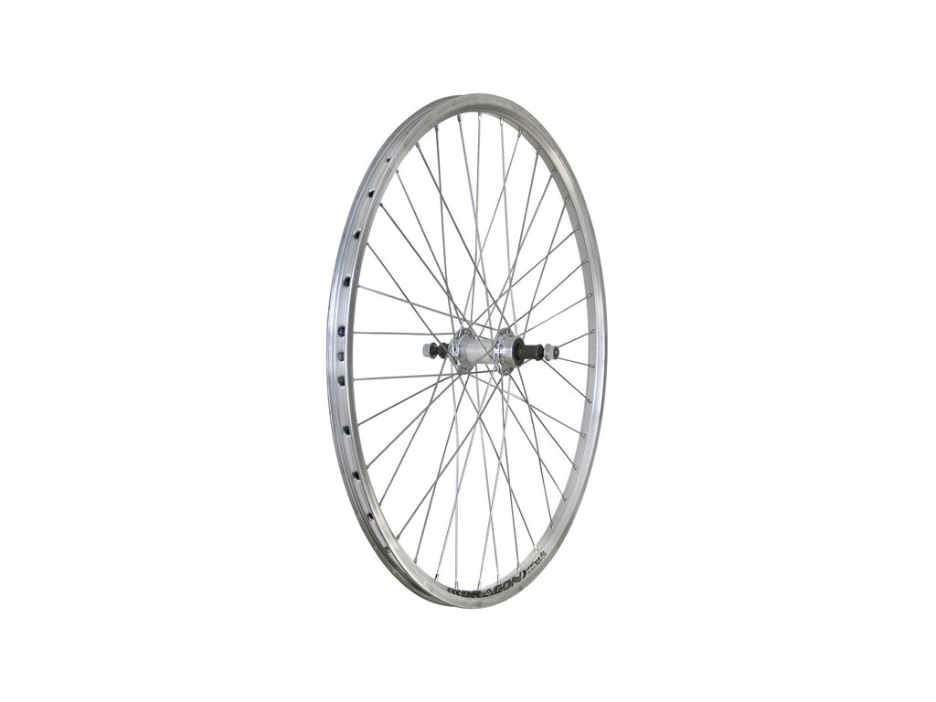 -Remerx Dragon L-719 559x19 Natural (stříbrný) dvoustěnný ráfek - náboj JOYTECH JY-754 s 32 otvory ze stříbrného duralu, osou s pevnou maticí 3/8'x135x175 mm a závitem pro 3 až 7 rychlostní pastorky volnoběžky - pozinkované dráty